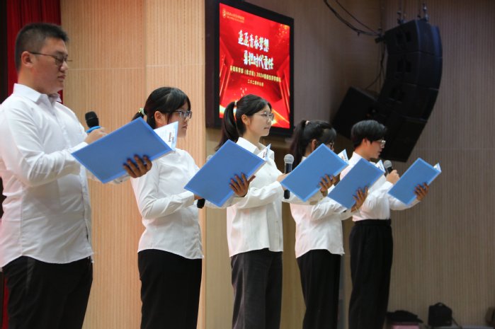 随后,24级“优才班”的同学:杨凯棋、陈绮遥、周棋君、尤欣韵和嵇家乐给大家带来一场精彩的诗朗诵《青春扬帆正当时,争做时代追梦人》。